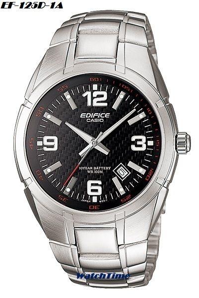 Мъжки часовник Casio EDIFICE EF-125D – 2 модела Продължителното осветяване на тъмно дори и след кратко излагане на светлина се осигурява от луминисцентното покритие на циферблата и стрелките. Показва текуща дата от месеца. Минералното стъкло е с леко сферична форма за елиминиране на отблясъците и по-добро разчитане. Верижката и корпуса са от неръждаема стомана. Завинтването на задния капак позволя