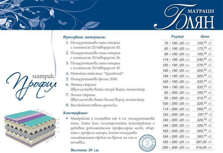 ДВУЛИЦЕВ МАТРАК "ПРОФИЛ" е съставен от четири слоя полиуретанова пяна,като към симетричната му конструкция е добавен 3D профилиран лист обърнат с профила нагоре,което дава на матрака допълнително масажиращ ефект по време на сън.