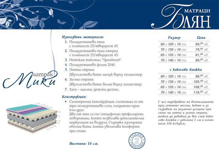 ДЕТСКИ МАТРАК "МИКИ"-е със симетрична конструкция,състояща се от три полиуретанови слоя,два от които са с 3D профилирани повърхнини което дава една добра циркулация на въздуха.За създаване на различно усещане при спане за лятна и зимна странаи и...