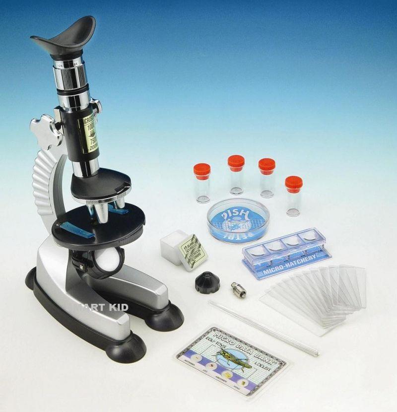 Детски микроскоп с увеличение 100x 750 със светлина и проектор 23 cm (9 ") микроскоп с окуляр на Хюйгенс"с гумени бордове • Цветни филтри • Micro люпилня • 12 празни слайдове • 12 Статични Slide • Cover (12) празни етикети • петриева паничка с лупа • 4 Флакона • бъркалки • Кондензатор Lens Cap • резервна крушка • Инструкц